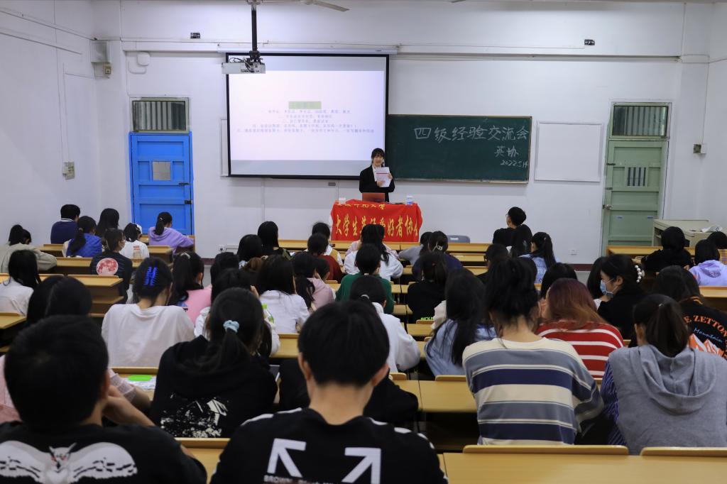 在活动上,4位在全国大学生英语四级考试中取得优异成绩的2020级学生向在场学生分享相关经验。汉语言文学专业2020级(2)班的学生李环欢从如何备考这个方面展开交流。“在考试之前,同学们每天需要做的事情是背单词、听听力、做阅读题,并练习翻译。”同时,李环欢还推荐了每日英语听力、英语流利说、英语帮等多款英语学习软件。