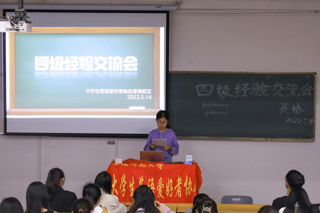 5月14日,大学生英语爱好者协会举办英语四级经验交流会,进一步加强校园文化建设,丰富大学生校园文化生活,提高学生们对全国大学生英语四级考试的了解程度。本次活动面向人文学院及黄梅剧艺术学院大一、大二全体学生。