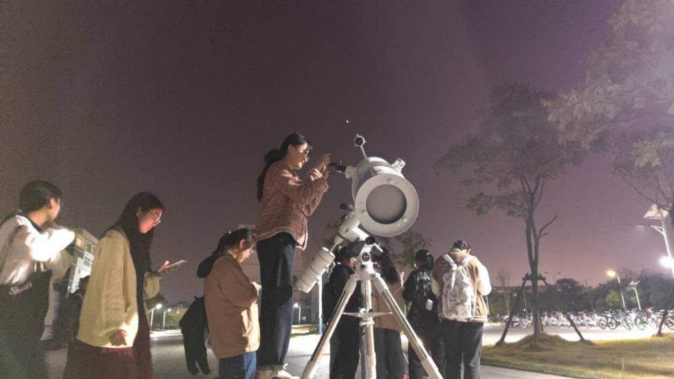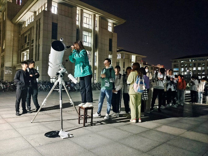10月11日,大学生天文爱好者协会于数理学院教学楼广场中央,开展“吟闲宇宙,伴行星辰”天文观测活动。数理学院2022级新生和天文爱好者协会成员通过天文望远镜“走向太空”,直观感受木星、土星、月球的全貌,领略宇宙的无穷魅力。