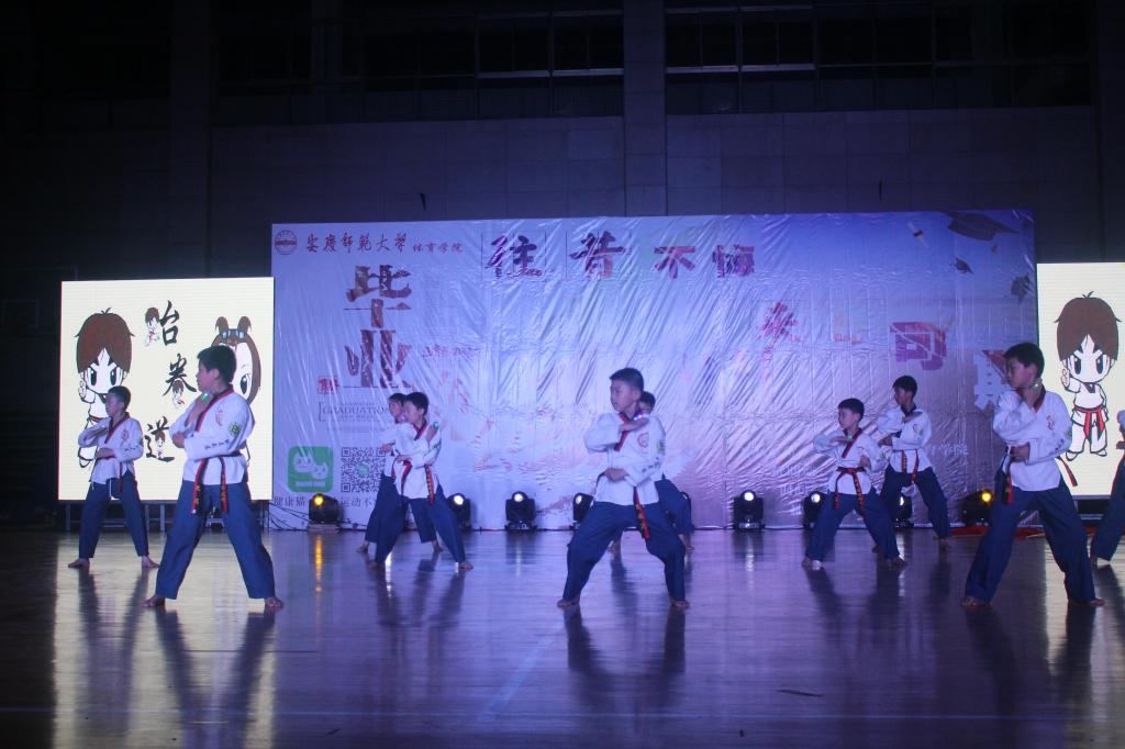 伴随绚丽的舞台灯光秀和2015级体表(2)班精彩的开场舞,晚会正式拉开帷幕。本场晚会共分为“不忘初心”、“勇于追求”、“往昔不悔,来日可期”三个篇章,节目内容丰富,引人入胜。第一篇章中,师院跆拳道馆的节目《旋风小子》,是由一群稚嫩可爱的小朋友们所带来,年龄虽小,一招一式却绝不含糊,引得台下掌声阵阵,瞬间点燃了全场的氛围。2016级梁艺等人歌曲《记 念》,“一边书写,一边怀念”,毕业生们的青春回忆在歌声中一幕幕上演。2017级新生合力演出的《舞所不能》更是引起热烈反响,大家为了师兄师姐卖力表演的舞蹈串烧,将青春的活力与创造完美展现,使得本场晚会步入高潮。第二篇章中,小品《光阴的故事》以幽默诙谐的话语表达出了流年易逝,也体现了当年不变的珍贵的情谊。青春岁月就如白驹过隙,从指间悄悄溜去,2015体表(3)班的现代舞《再见青春》,精美的编排和精湛的舞技将青春的不舍和留念表现得淋漓尽致,带动了毕业生们的思绪,使在场的观众为之折服。李杰等人的经典朗诵《致橡树》和歌曲《春风十里》,抑扬顿挫的声调,抒发着情怀,表达着祝愿。晚会最后一个篇章,是由体育学院学生会主席团为师兄师姐们送上的特殊的情景剧祝福——《365个祝福》。在一首大合唱歌曲《栀子花开》的感染下,全场氛围突破泪点,在大屏幕放映的毕业视频中,每一个熟悉的老师亲切的祝福话语里,满含着四年来相互陪伴的真情。至此本场毕业生欢送会划上了圆满的句号。所有毕业生们与老师们合影留念并拥抱告别。(汪洋)