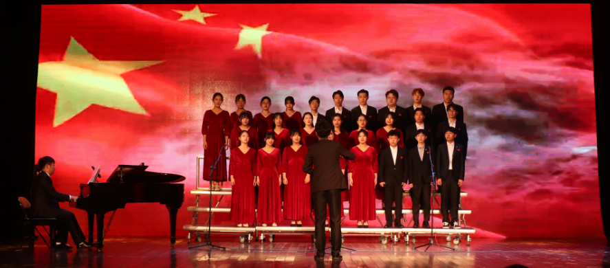 奔流不息的黄河、迎风飘扬的五星红旗、洋溢着笑容的少数民族儿童……这是音乐学专业2019级(4)班演唱歌曲《走进新时代》时背景屏幕上出现的视频片段,班级学生在合唱中特色穿插双人互动对唱、独唱与伴唱交织等形式,赢得了在场师生的掌声。演唱结束后,音乐学专业2019级(4)班全体学生还手握右拳,庄严宣誓,铿锵有力。“我们庄严宣誓的灵感来源于电视剧《觉醒年代》。此外,这次表演我们吸取了之前班级音乐会的经验,反复练习,了解歌曲背景故事,在这个过程中我对党的爱戴和尊敬也提高到一个新的境界。”音乐学专业2019级(4)班的董旭升说。