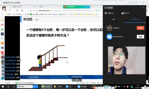 课前,郑馨将视频、ppt等学习资料上传至超星学习通,让学生做好课前预习工作,提前进入学习状态。在线课堂上,郑馨将钉钉直播和学习通在线教学平台有机结合。首先,通过汉诺塔游戏作为课程案例导入,激发学生的学习兴趣;接着,通过大量的视频动画由浅入深带大家逐步了解递归模型和递归调用过程;最后,再回归到案例导入,通过建立递归模型到编写递归算法,最终解决了案例导入中提出的问题。在教学活动中,郑馨熟练使用超星学习通的主题讨论、词云、测验、抢答和分组任务,以及钉钉直播的桌面共享、连麦等功能,充分调动了学生学习的积极性。课后通过超星学习通发布了限时课后作业,增强了学生对课程内容的掌握,并进一步提升了实际应用能力。