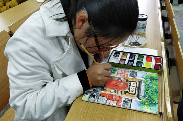 大家的创作内容既有安庆黄梅戏的脸谱,又有师大的标志性象征,洋溢着浓浓的文化气息,引起不少人的围观。“画画是我从小的爱好,上次去了菱湖校区,我觉得敬敷书院很好看且很有文化底蕴,是师大的标志性建筑。所以决定画这个。”旅游管理专业2017(1)班的曹逸云将菱湖校区的敬敷书院作为绘画的内容,这幅画很快吸引了同学的目光。她表示自己当时拍了照片,回来后首先对着照片勾勒出基本的线条,用彩铅铅笔画出线稿,想好构图,再上一层淡淡的底色,之后再开始绘画。谈及画画中遇到的困难,她说:“构图的问题比较复杂,因为要自己构思出大致轮廓,所以反反复复打了很多遍草稿,其次是水彩不太好控制,有的时候会晕开,但是还是会坚持画学校的敬敷书院,因为我很喜欢。”