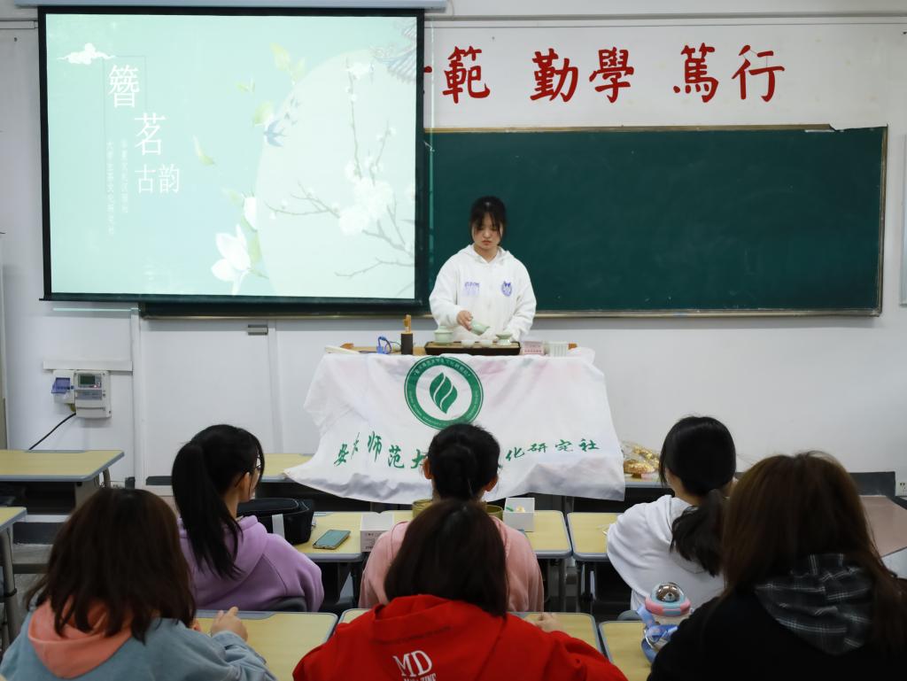 在《高山流水》的轻缓配乐中,中国语言文学类专业2021级(7)班的学生王嘉蔚向大家展示了温杯、洗茶、品茶的全过程,动作有条不紊、优雅从容。“社长之前教过我茶艺,而且我自己也会经常练习,自然就熟能生巧啦。”面对大家的一致好评,王嘉蔚道。