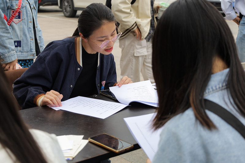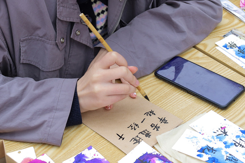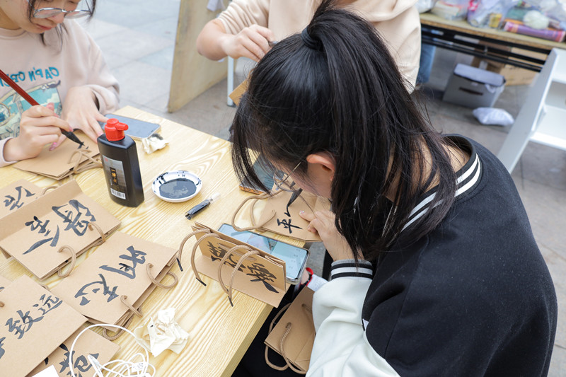 “担当,勤学,初心,笃志……”在活动现场,计算机科学与技术专业2020(4)班张文丹“现炒现卖”,挥笔在纸袋、卡片、木扇上写下一个个词语,并将其作为奖品送出。“我们书法部和绘画部在活动中交流、合作,每个理事各司其职,一起努力把活动做好。即使有些辛苦,但更多的是收获了满满的快乐和成就感。”她表示,自己的作品能受到众多同学的喜欢,感到十分自豪与荣幸,今后仍会积极参与类似活动,给大家带来欢乐。