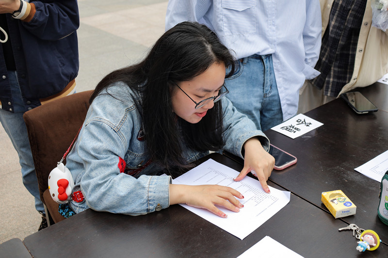 “你答对了9题!”“正确率好高,好厉害!”“哇!我得到了一个本子!”……4月30日,大学生书画协会利用周末一整天时间,分别在东苑食堂及西苑食堂门口两个地方,开展首次书画知识竞答活动,用游戏学习知识,吸引了近500名学生参与。