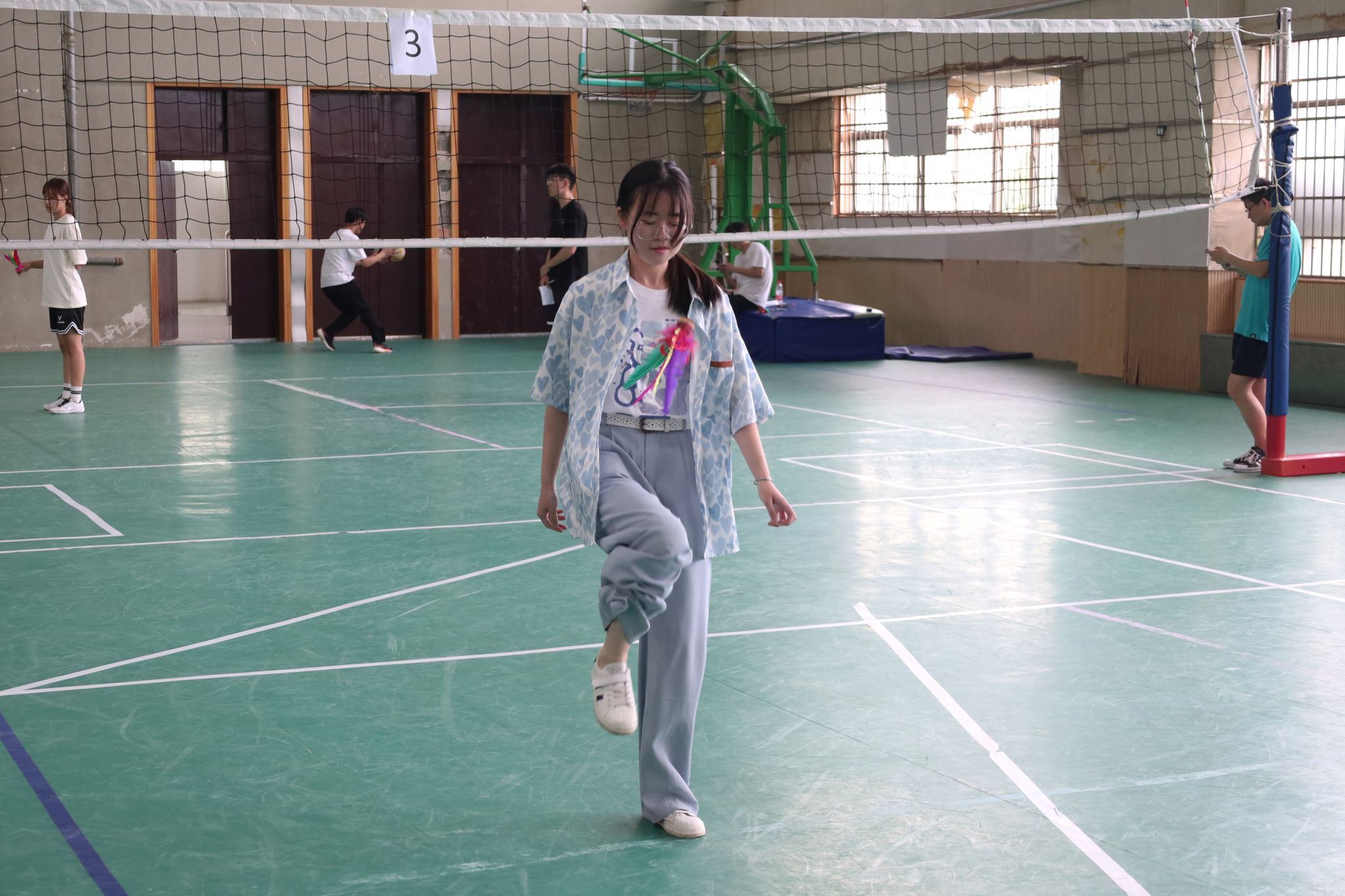 膝若轴、腰如绵、纵身猿、着地燕……随着哨声响起,学校首届毽球比赛开始了。选手们灵活控制羽毛毽,轻吊、挑球、扣杀、跳踢,一套动作行云流水。观赛区的学生送上了阵阵喝彩声,不断为赛场上的选手鼓掌加油。