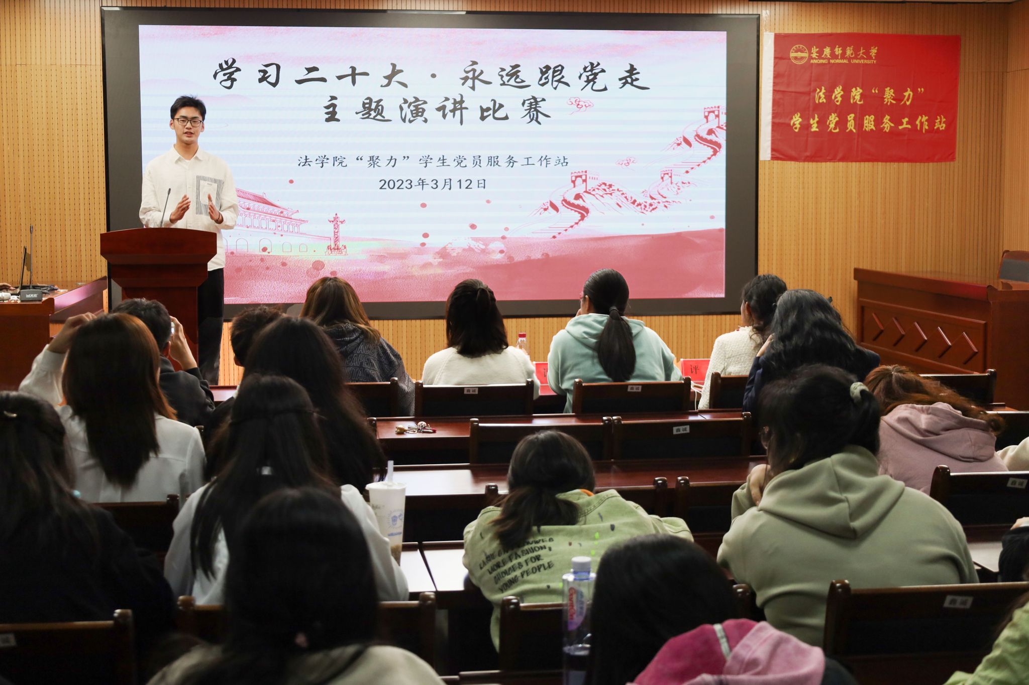 近日,法学院“聚力”学生党员服务工作站举办“学习二十大,永远跟党走”主题演讲比赛。此次比赛共有17名选手参赛,吸引百余名学生前来观看。