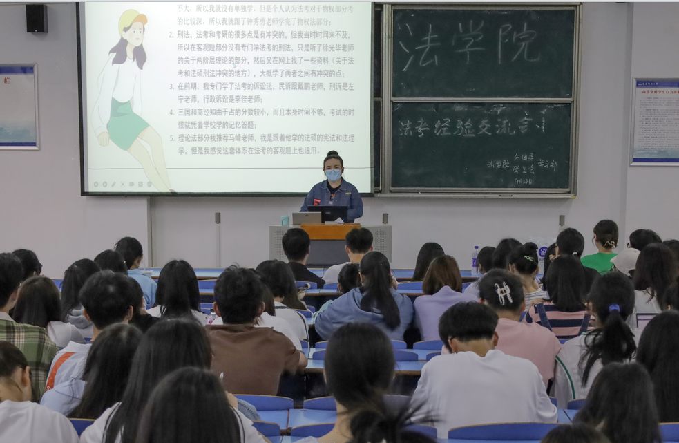 4月23日,法学院举办2022年法律职业资格考试经验交流会,邀请法学专业2018级(2)班的董梦婷和法学专业2018级(1)班的夏淼两位学生作为主讲人分享法律职业资格考试经验,吸引150余名同学前来观看。