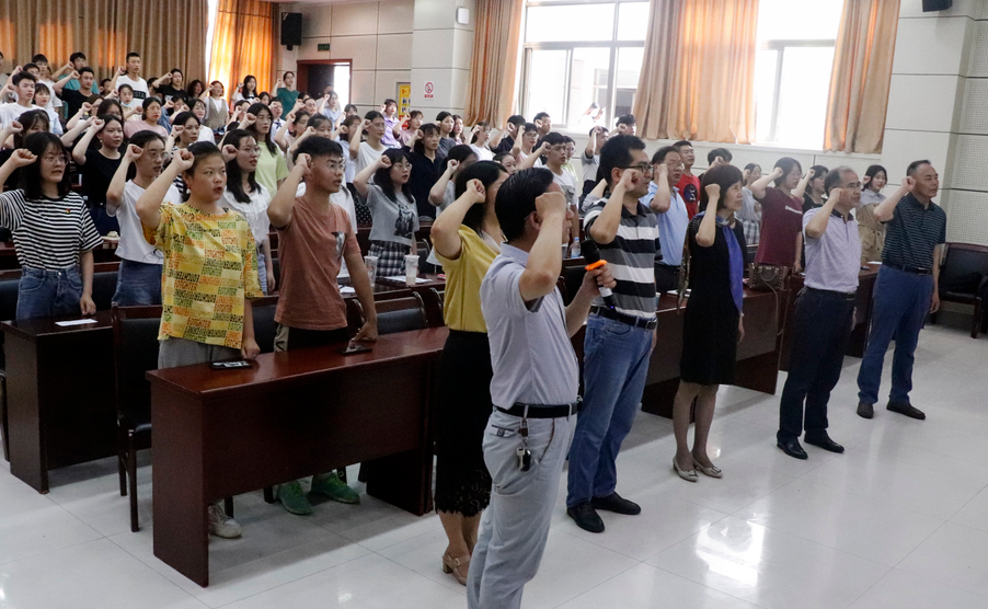“我志愿加入中国共产党,拥护党的纲领,遵守党的章程,履行党员义务……” 6月2日,法学院学生党员服务工作站揭牌仪式全体与会党员在学院党委书记詹德全的带领下,面向党旗,举起右拳,庄严宣誓。回顾铮铮誓言,坚定理想信念,牢记初心使命。