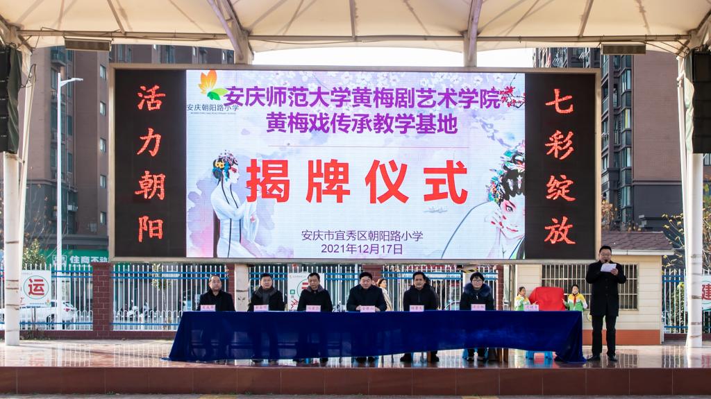 12月17日,黄梅剧艺术学院与宜秀区朝阳路小学合作共建黄梅戏传承教学基地举行揭牌仪式。黄梅剧艺术学院执行院长金根山、副院长储著炎,宜秀区教育体育局副局长马宏岱,大桥中心学校校长余金明、副校长吴成华,朝阳路小学校长沈晓青及部分师生代表出席揭牌仪式。