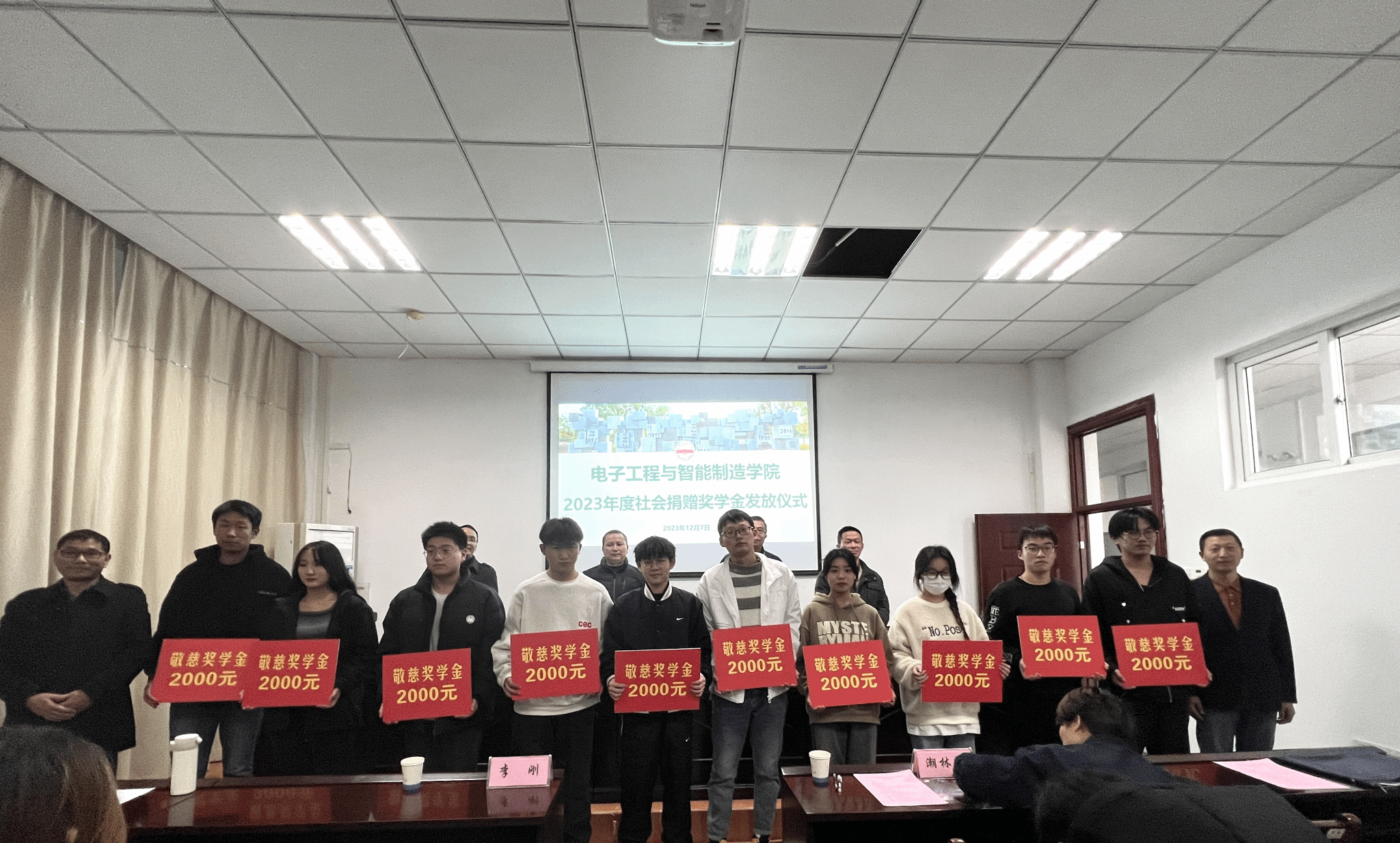12月7日,电子工程与智能制造学院在稼先楼南104会议室举行学院2023年度社会捐赠奖学金发放仪式。江苏朗恩斯集团安庆思伟奇智能科技有限公司副总李宣、校友总会办公室副主任方申荣、学院领导班子成员出席仪式。班级辅导员、各班级学生代表以及2023年度社会捐赠奖学金获奖学生参加仪式。仪式由学院党委副书记高栋梁主持。
