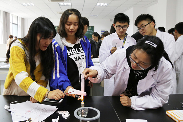 不少非化学专业学生参与了此次实验活动也表示乐在其中。“因为我本身比较喜欢动手制作东西,以前也对化学实验有一定的接触,感觉挺有意思的,这次来很想多了解一些有趣的化学知识。”生物技术专业2017(1)班的张玥说,这些有趣的化学实验不仅能增长知识,还能丰富课余生活。