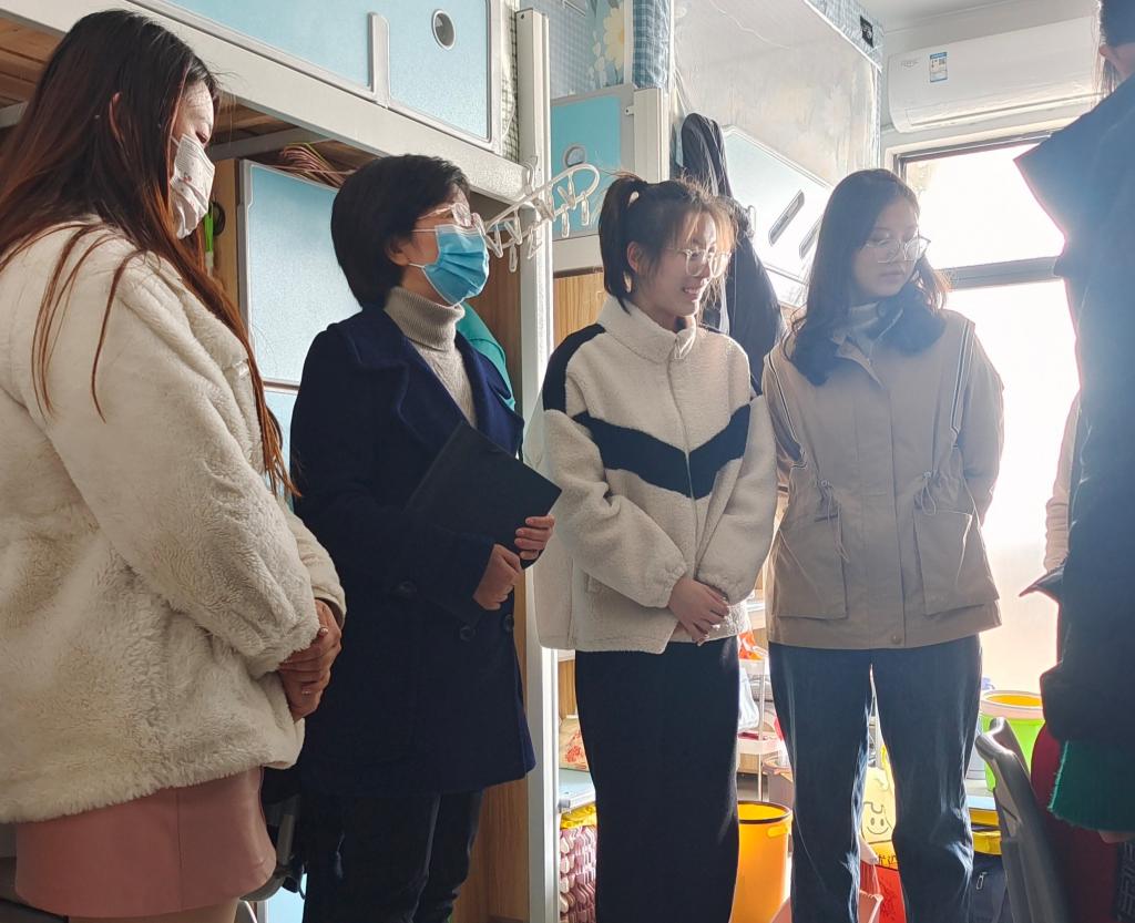 会后,彭芳珍带领专兼职辅导员深入学生宿舍走访调研,学生们热情的向学院领导老师介绍宿舍情况,并分享了她们充实而又快乐的寒假生活。老师们也询问了同学们的学习情况以及新学期的学习计划和目标,并嘱咐他们在日常生活中要做好疫情防控,及时参与学校安排的免费核酸检测,在学习上要以更加饱满的热情去迎接新学期、新课程,上好每一堂课,学以致用,学有所成。(撰稿、摄影:黄兴强 编辑:江伟 审核:彭芳珍 钱敏)
