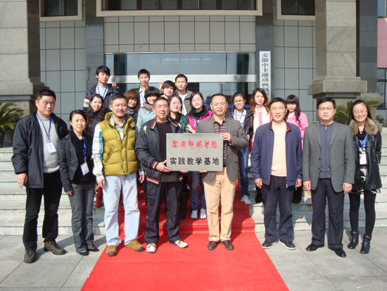 安徽中卡通动漫制作有限公司总经理杜攀峰热情接待美术学院领导班子一行,并简要介绍了公司的基本情况、产品研发及发展思路。在仔细考察公司动画产品制作流程后,双方就建立动画专业实习基地进行了深入协商,达成了共建动画专业实习就业基地的共识,并举行了“安庆师范学院实践教学基地”授牌仪式。