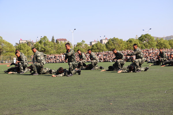 立正、稍息、齐步走、跑步走、向左转、向后转、向左看齐、向右看齐……随着教官的一个个指令,同学们一丝不苟,依令而行,各方阵军容严整,身姿挺拔,站立如松,步伐坚定。娴熟的动作、饱满的热情、矫健的身姿以及坚定的眼神无一不展现着新生们经过这14天军训生活的蜕变,而台下同学们经久不息的掌声和尖叫声,更是对表演同学的肯定与支持。阅兵仪式后,由24名教官进行的汇报表演特色鲜明,气势如虹,博得了现场师生的阵阵喝彩。