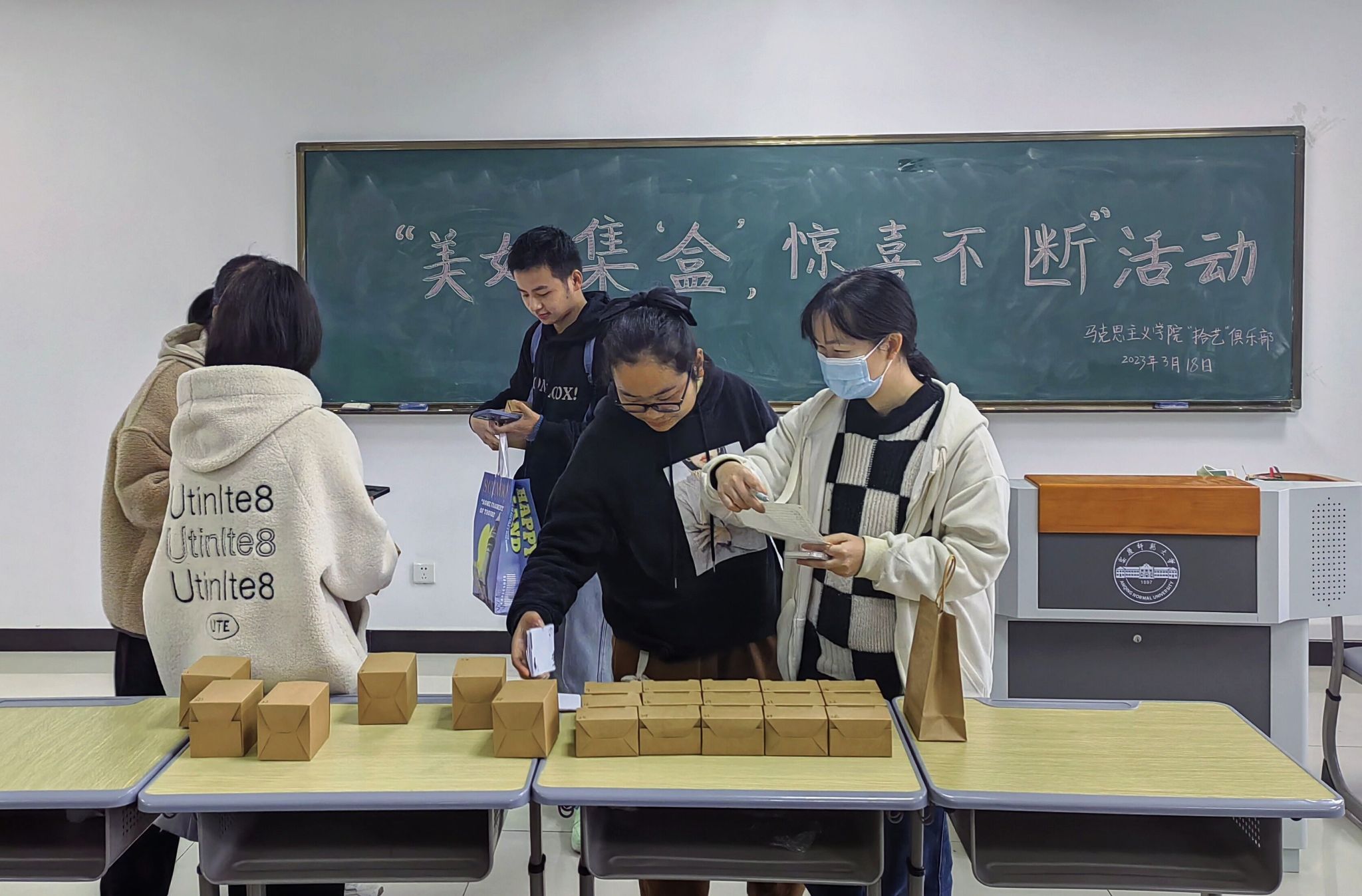 “这是我室友做出来的手工作品,被我挑选到了!”一个惊喜的声音从马克思主义学院传出。3月18日,马克思主义学院“拾艺”俱乐部开展的“美好集‘盒’,惊喜不断”盲盒活动正进入尾声。参与活动的同学们在最后的交换环节抽取盲盒,收获惊喜与快乐之余,也收获了一份盲盒礼物。