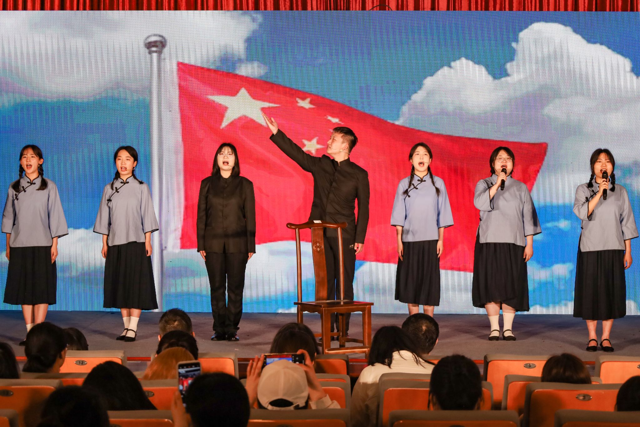 重庆向来有“英雄之城”之称,抗日战争时期,重庆人民将民族利益看得高于一切。人文学院朗诵队带来的《雾重庆》,句句泣血,讲述着那段沉重的历史过往。富有年代感的人物服饰,慷慨激昂的诗歌朗诵,引发了现场观众共鸣。表演者之一、历史学专业2021(3)班的黄浩宇表示:“作为青年大学生,我们要增强对红色文化的理解和感悟,学习先辈革命精神。”