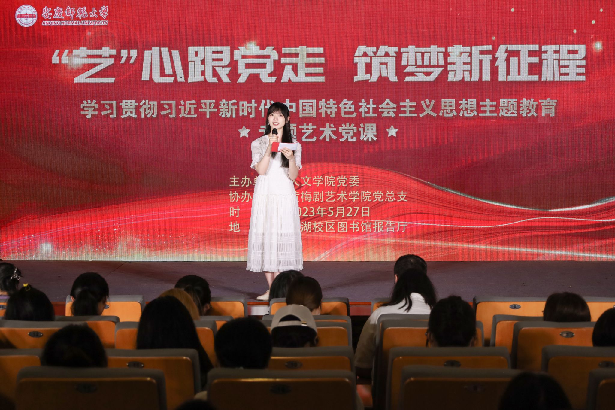 5月27日,一场主题为“艺心跟党走,筑梦新征程”——学习贯彻习近平新时代中国特色社会主义思想主题教育专题艺术党课在菱湖校区图书馆报告厅拉开帷幕。党委组织部副部长吕佳、人文学院党委副书记王波、黄梅剧艺术学院副院长刘国平出席活动,两院学生党支部书记等教师代表、第67期入党积极分子、第3期青马班学员近230余人到场观看。