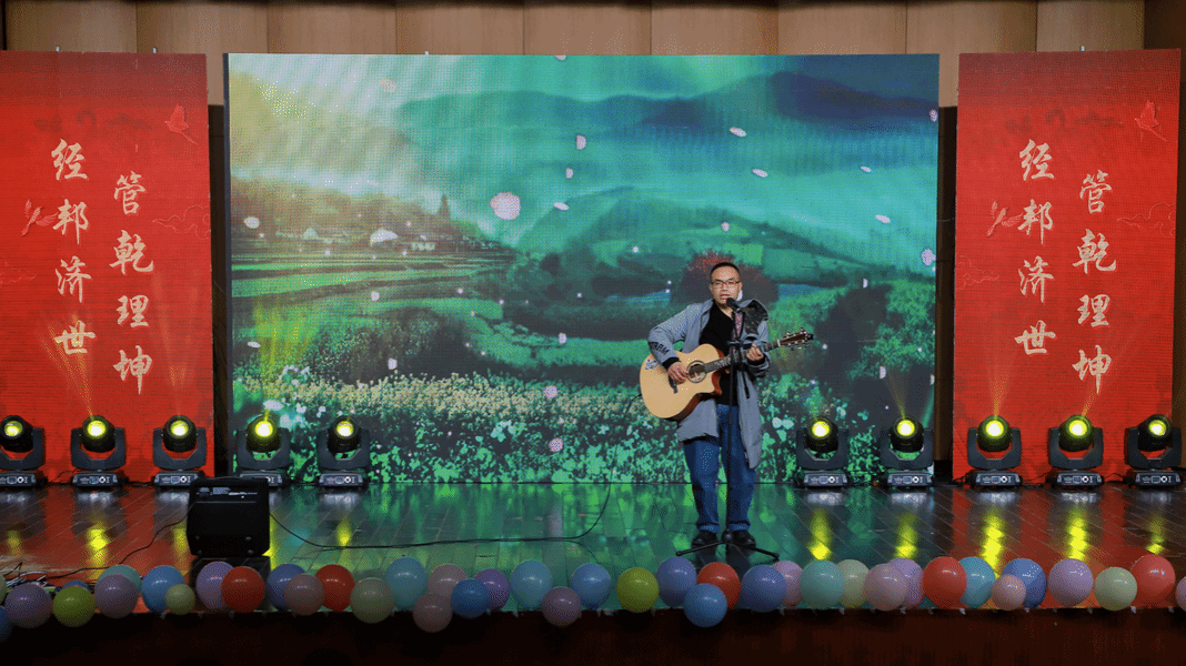 学院的老师们也参与到晚上表演中,李裕鸿老师带来的歌曲《最远的你是我最近的爱》将全场气氛推向高潮,刘鹏飞和李颖老师的歌曲《我们都是追梦人》更是作为压轴节目最后出场。现场观众纷纷挥舞着双手,有节奏地打着节拍,营造了师生共乐的和谐欢乐氛围。