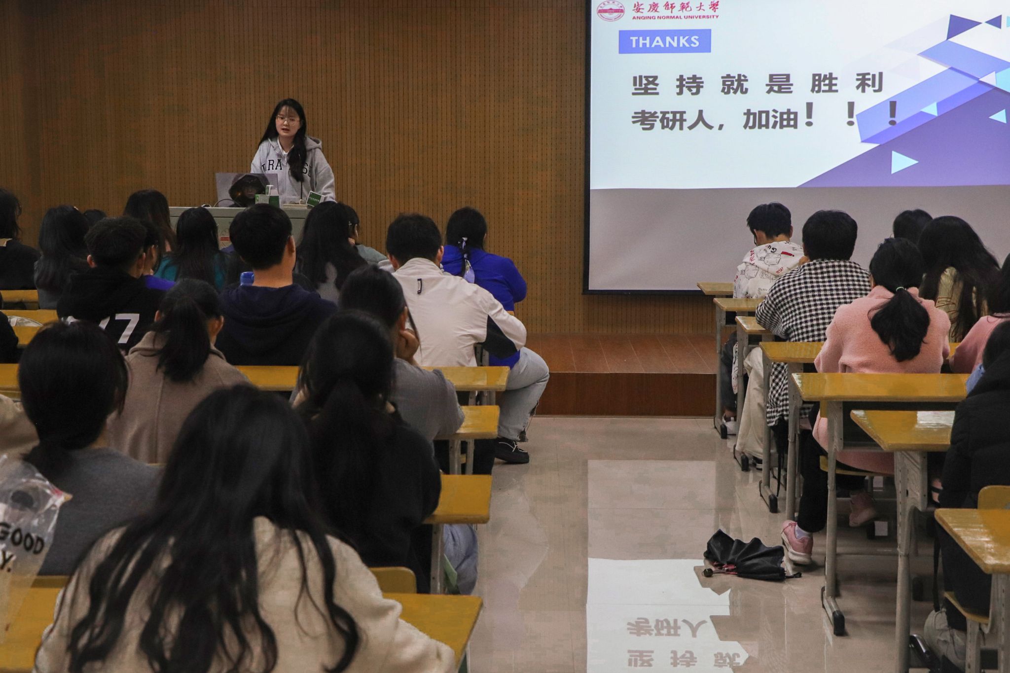 顺利考上安徽大学的王礼芳从择校准备、复习策略、心态调整等方面与学生们分享自己的考研经验。她表示,择校前应综合考虑自身情况、真题难易程度、报录比等因素,选择最适合自己的院校。谈及考研期间的心态问题,她说:“平稳心态很重要,如果想要减少后期焦虑可以提早开始准备”。她给学生们送上提高效率的“小妙招”:加入考研学子的交流群或者组织,实现“消息共享”,获取更多资料。