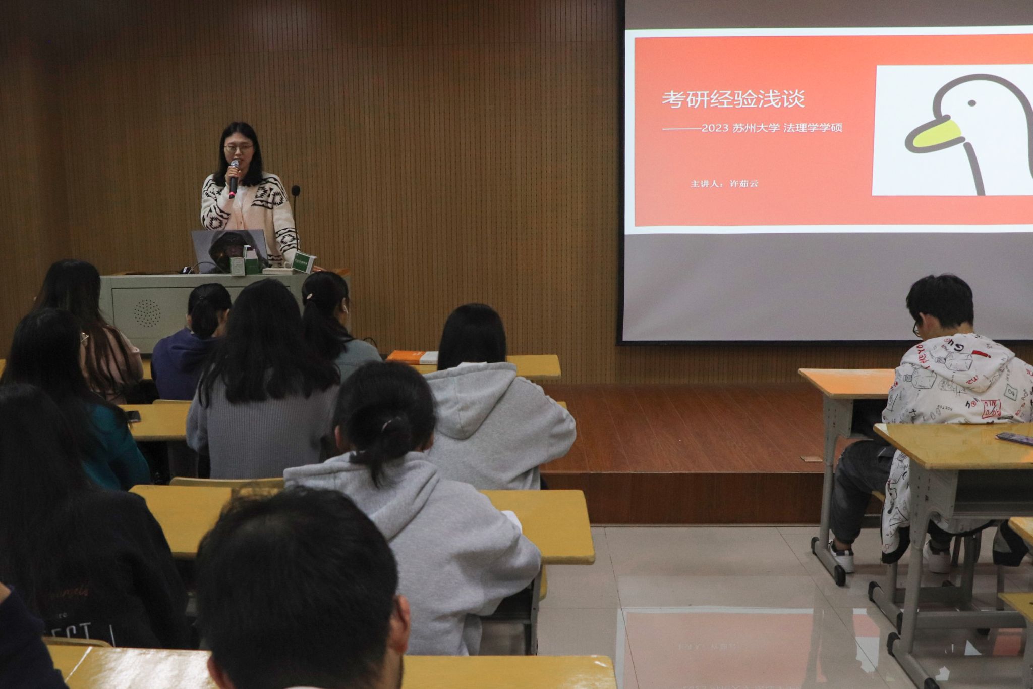 4月22日,法学院在O401教室举办考研经验交流会,社会工作专业2019级的王礼芳和法学专业2019(2)班的许茹云为在场学生“传经送宝”。近百名学生到场聆听分享。