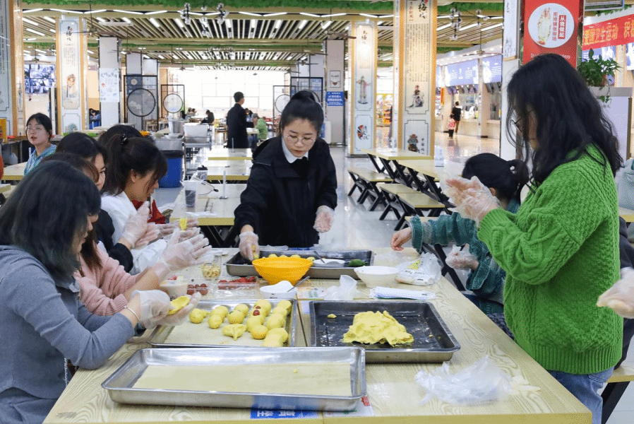 “面皮要先揉成饼状,沾上一点食用油,这样才会更好包。然后加入咸蛋黄馅或者红豆馅,团成一个球形……”在后厨,食堂工作人员耐心教同学们制作技巧,一个又一个精美玲珑的青团呈现在大家面前。同学们跃跃欲试,迫不及待地想要“大展身手”,纷纷投入到制作行列当中。
