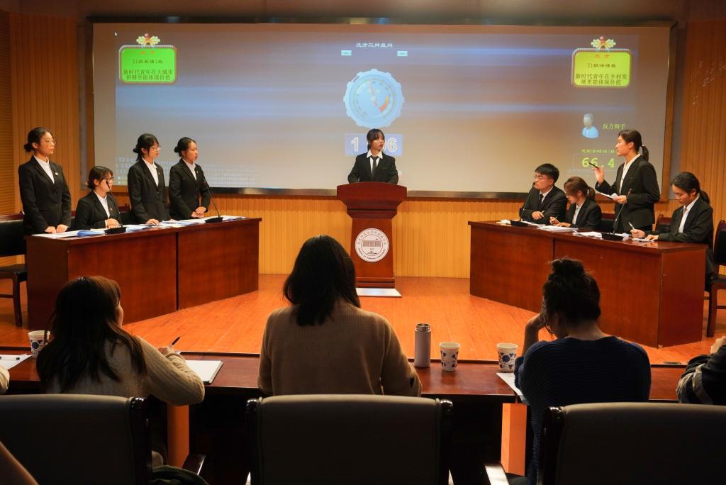 比赛进行到第二场,外国语言文学类专业2021(3)班代表队与法语专业2021级代表队围绕“新时代青年在城市拼搏还是在乡村发展更能体现价值”展开激烈辩论。“乡村需要何种类型的人才?”“是否承认乡村振兴需要特定的人才?”“乡村振兴需要的人才与辩题中的新时代青年是否一致?”……正方外国语言文学类专业2021(3)班代表队从反方辩题的角度出发,步步紧逼,寻找漏洞,对反方队伍展开犀利盘问。“如今国家对投身于乡村振兴战略的人才进行政策扶持,他们扎根农村、服务农村,不能把他们局限于特定的专业群体。”反方二辩法语专业2021级的王希通过列举大学生村官秦玥飞的事例从容应对,毫不示弱。双方辩手针锋相对,唇枪舌战,将现场气氛推向高潮。