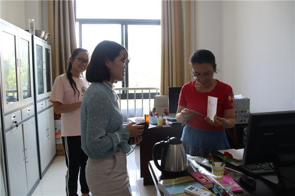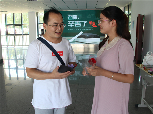 “好可爱啊”“这个设计很有新意哎”“这是我收到过最好的教师节礼物”……9月10日下午上课前,教师教育学院的21名学生将亲手制作的贺卡和悉心包装的康乃馨送给前来上课的老师,并送上教师节祝福。