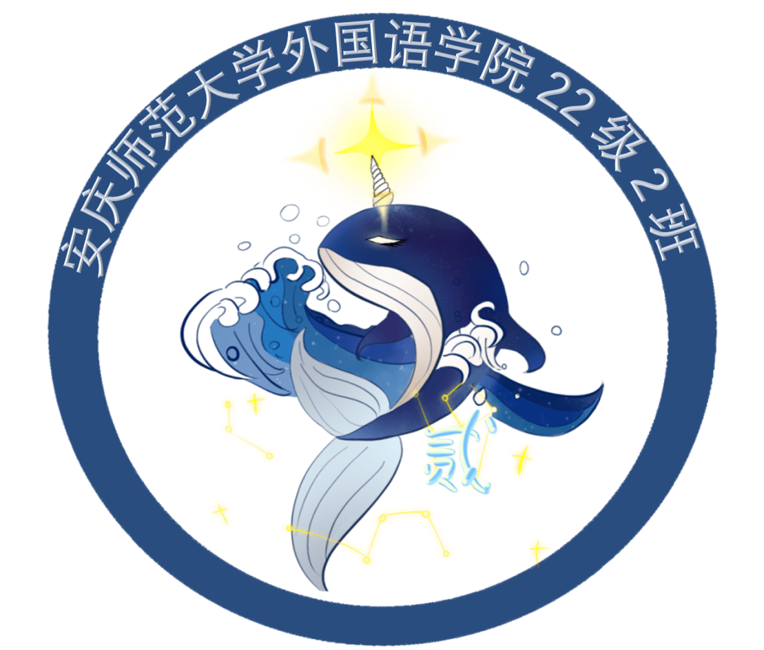 简单大方,富有想象力是2022级外国语言文学类(2)班班徽的最大特色。班徽以鲸鱼为主体,代表了二班全体同学乘风破浪、勇往直前的决心和远大志向,鲸鱼头上的灯光象征着在前进的道路上坚定初心,向光而行。