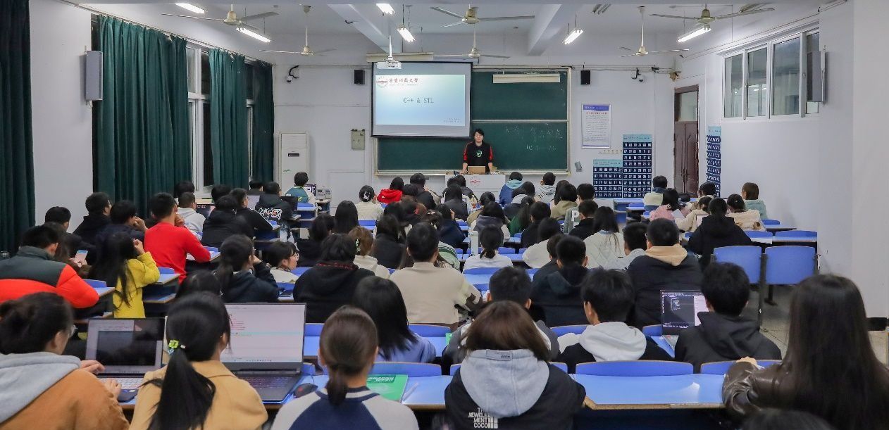 11月12日,计算机与信息学院于C楼105教室,开展计算机编程实操课程培训。“只需要一行代码,就可以少写几十个头文件……”课上,授课学生、计算机科学与技术(工)2021级(2)班的乔添歌正在向学生们介绍程序设计竞赛中的技巧。