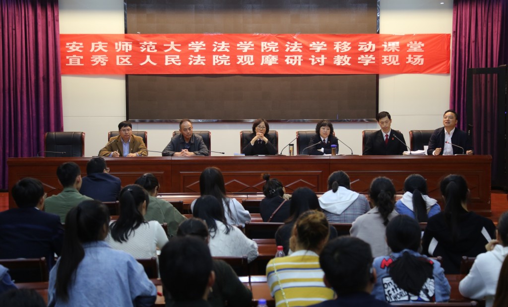 在移动中,有序开展。上午9时30分,法庭庭审在宜秀区人民法院大法庭正式开始,整个庭审活动持续四个半小时。在观摩庭审环节,参加移动课堂的全体同学严格遵守法庭审判纪律,仔细聆听,细心领会。观摩中,对庭审活动涉及的案件性质和事实认定进行学习、鉴别与研判,对法律职业人在庭审中所运用的思维方法、适用法律的技能、诉讼技巧、展现的法律人综合素质等进行观察、思考和学习。在审判结束后,下午15时20分,互动研讨教学在宜秀区人民法院三楼会议室开始,历时一个半小时。宜秀区人民法院刑事审判庭何燕庭长、李恒圆法官、宜秀区人民检察院公诉科鲍卫萍科长和安徽益上律师事务所黄益主任担任法律实务教师,法学院部分教师和全体学生参加互动研讨教学。互动研讨主要从三个方面依次进行。首先,法律实务教师分别从审判、控诉和辩护等不同角度对案件进行分析,激发同学们对案件的多维度思考。其次,同学们提出观摩后发现的问题,由各相关法律实务教师进行一一解答。最后,法学院朱留虎副院长对互动研讨教学进行归纳总结,并对同学们的表现进行了肯定评价。