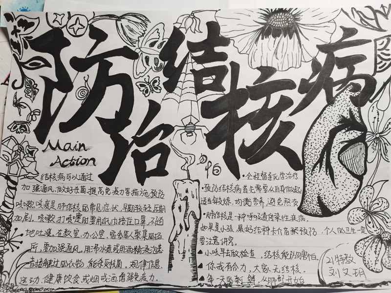 在22副手绘作品中,一副中间写有“结核病防治”“Fighting”字样,旁边为一个带着口罩、拿着花的女孩,并伴有洗手液、花朵、药品等元素点缀着的作品格外引人注目。这幅作品出自生物科学类专业2021级(3)班学生的张婉婷之手,她表示,“口罩”和“洗手液”代表如何提前防止患病,“抗生素”和“打疫苗”表示如何治疗,“小女孩”和“花朵”则象征着正确防治结核病后能带来美好和希望。”平时就喜欢画画的张婉婷在了解到这个活动时便第一时间报名参与了此次活动。