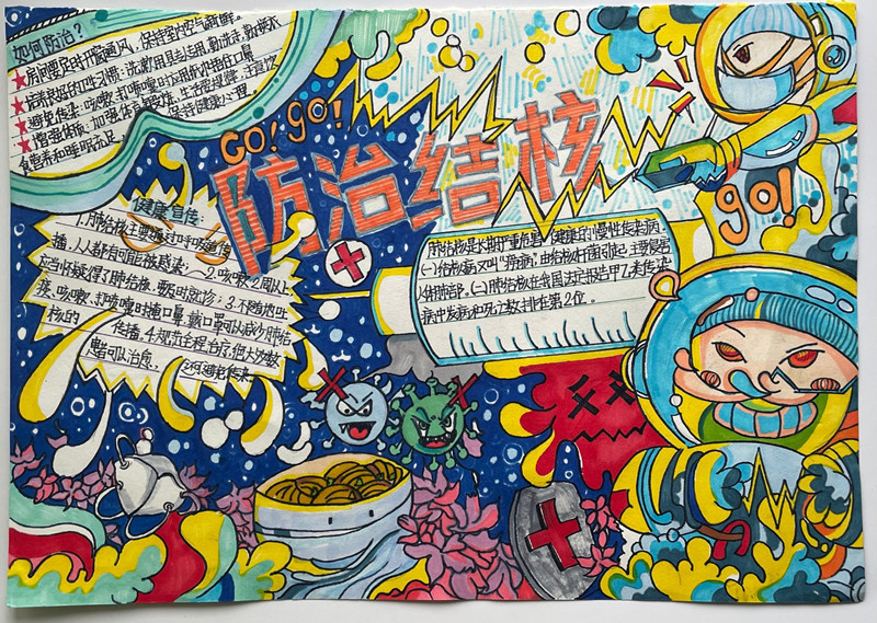 “通过大片的蓝色背景表达结核病的高传染率,以夸张的画法画了两个医护人员拿着注射器在消灭细菌病毒,口罩则表示结核病毒是通过飞沫传播出门要戴口罩。”这是美术学专业2021级(2)班的学生陶悦的手绘作品,她道,作为一名美术专业的学生,通过手绘进行结核病防治宣传,不仅能够运用自己的专业所学,还让她对结核病防治有了更深一步的了解,让她收获颇丰。