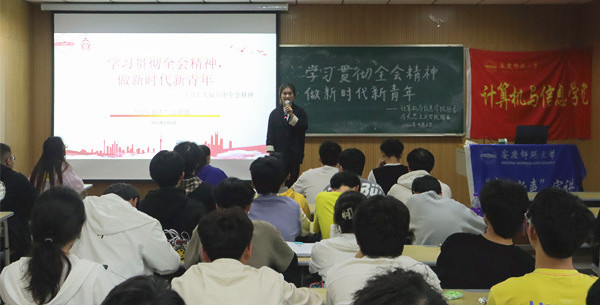 “党的十九届六中全会是什么时候召开的?”“十九届六中全会通过的决议是历史上第几次重大决议?”……4月6日,计算机与信息学院邀请了“青年新声”宣讲团于L314教室开展“学习贯彻全会精神,做新时代新青年”主题宣讲。学院第二期“青马班”全体学员、2021级各班级团支书共55人参加了宣讲会。