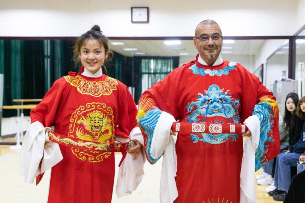 会议还组织参观了黄梅戏教学成果展示厅、服饰陈列室等,现场观看了折子戏《路遇》、《女驸马》、《打猪草》。外籍友人兴致盎然地询问戏曲程式动作蕴含的意义和表演要点,并穿上戏服亲自体验。