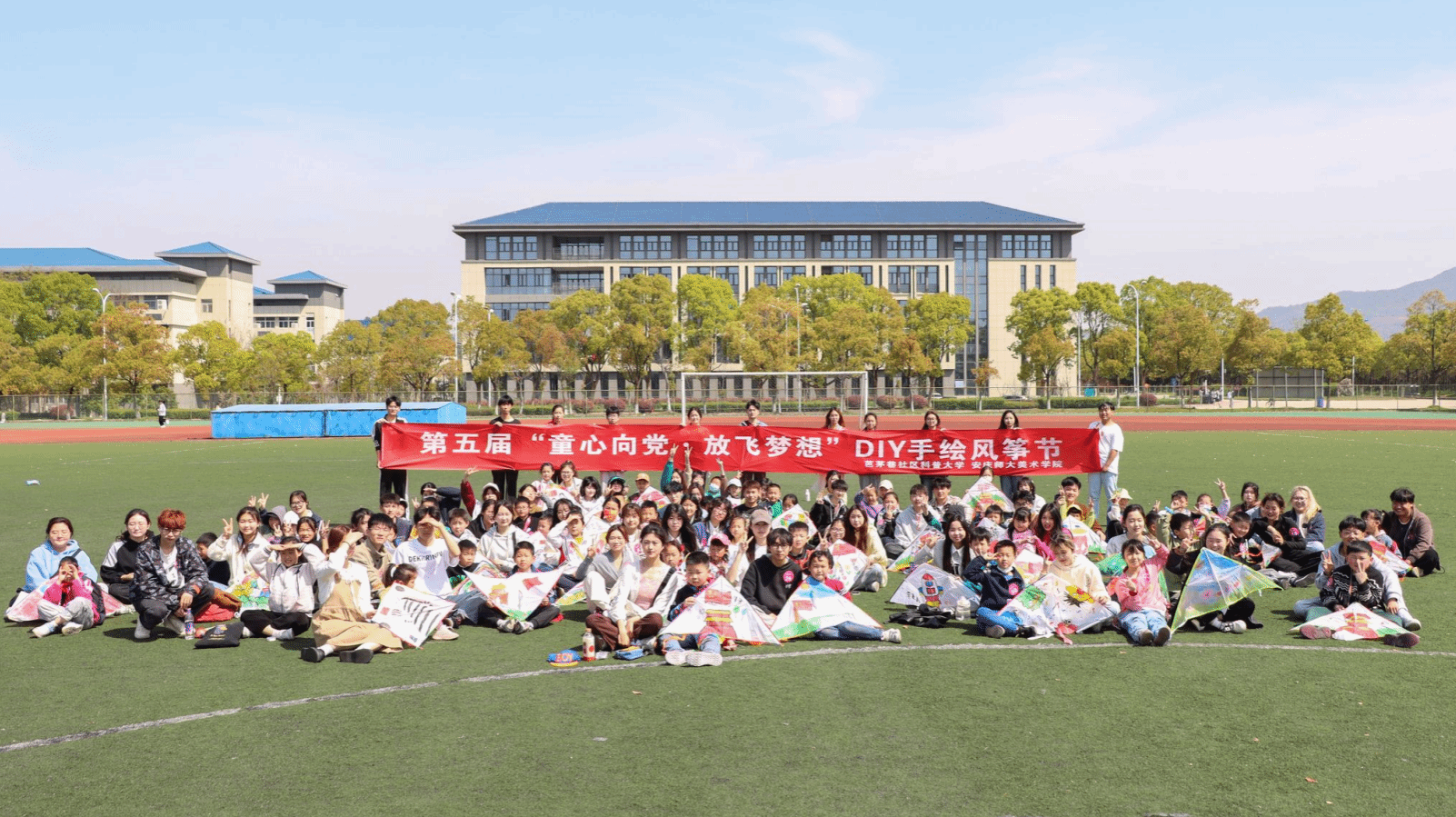 五星红旗、北京天安门、Q版雷锋……龙山校区南田径场上,54名儿童在大学生志愿者带领下,手握画笔,发挥想象力,将各种红色标志、字眼在风筝上描绘呈现。4月9日,美术学院联合安庆市卓尔社工、芭茅巷社区科普大学、芭茅巷社区家长学校共同举办第五届“童心向党,放飞梦想”DIY手绘风筝节活动。大学生与小朋友们同绘风筝,以DIY绘画方式,向孩子们传播爱党爱国教育。