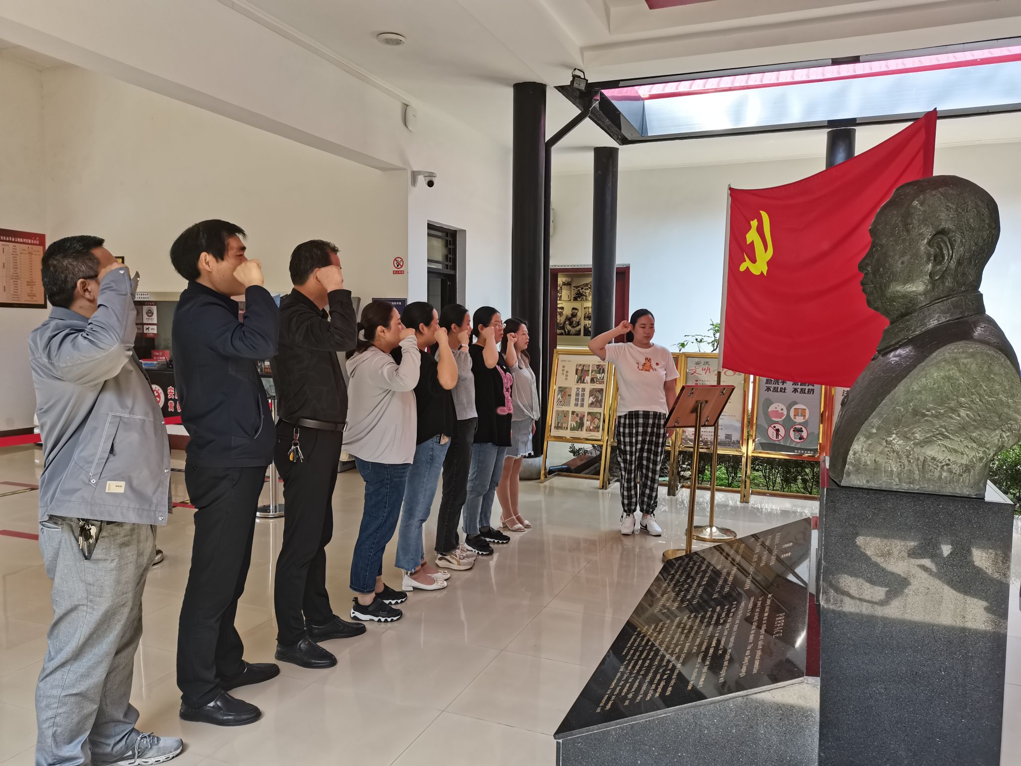 会后,全体党员赴黄镇生平事迹陈列馆开展实地教育活动。全体党员面向党旗重温了入党誓词,依次参观了陈列馆中将军之旅、外交之途、艺术之路等展厅,通过丰富翔实的珍贵图片、实物及文献史料,系统形象了解了黄镇作为将军、外交家、艺术家革命的一生、战斗的一生和无私奉献的一生。听着解说员生动详细的解说,深深感受到革命先辈崇高的理想追求和非凡的人格魅力。