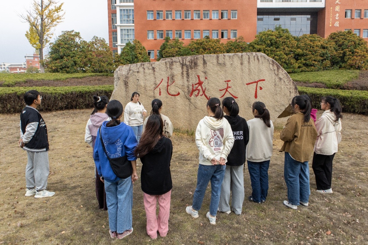 从生命科学学院出发到音乐厅结束,生物技术专业2021(1)班的胡勤化身为“小老师”,将讲解与提问相结合,帮助新生记忆沿途植物特点。当路线经过图书馆,她还特意讲解石碑题字“化成天下”含义,以激励新生努力学习。“和大家一起学习非常有趣,我很享受向学弟学妹讲解植物知识的过程。”