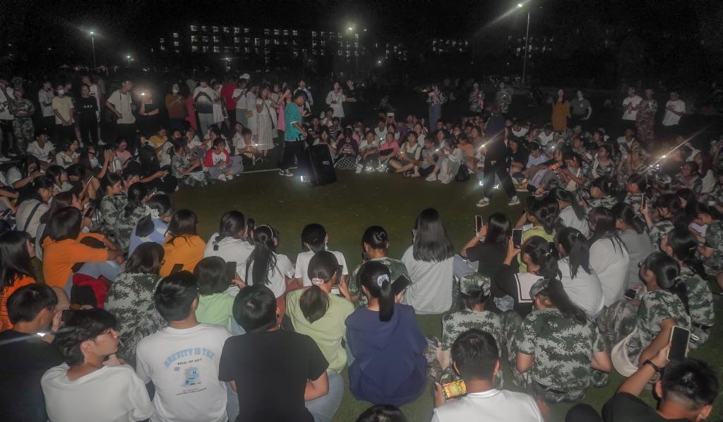 “刀光剑影交错,而我枪出如龙,乾坤撼动,一萧破苍穹……”一首朗朗恢弘的豪迈歌曲《踏山河》拉开晚会序幕,歌舞、朗诵、相声等形式多样的26个节目轮番上场,现场掌声与欢呼声连成一片。化学工程与工艺专业2021级(1)班的陶萧宇主动报名参加表演,现场一曲婉转悠扬的《阴天快乐》,让许多新生一扫疲惫。“军训的太阳让人又爱又恨,愿以后的军训时光快乐没烦恼。”陶萧宇希望借这首精心挑选的歌曲为军训划上完美的句号。