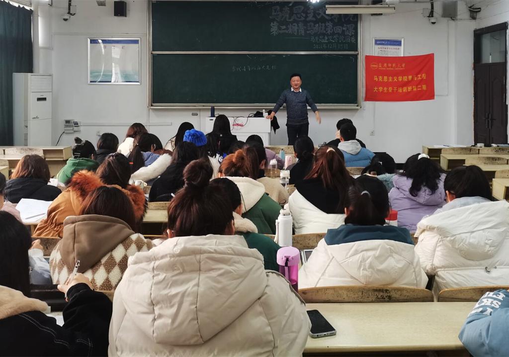 12月15日,马克思主义学院第二期青马工程培训班第四课开课,学院党委副书记邹斌围绕“当代青年的历史定位”的主题为青马班学员授课,引导学生培养身份意识,勇做担当民族复兴大任的时代新人。