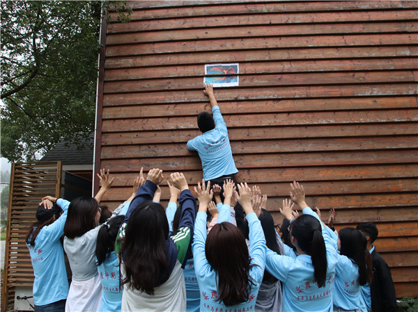各组转圈轮流按住手掌下的水管,使得水管不倒,在距离地面近3.7米的墙面上完成拼图。四项活动,共花费四个小时。每支队伍完成一个挑战后,负责该游戏点的老师便会带领大家进行五分钟的心得分享,大家畅所欲言,说出自己的感受,“我们都很棒!”“每个人都会去思考,会去努力。”