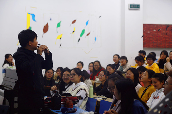 “同学们,大家都知道中华上下五千年,可你们知道笛子已经有八千多年的历史了吗?”民乐协会的创始人颜颜对现场的观众发出了疑问。颜颜是beat365英国官网网站音乐学专业2012级的学生,现在的他已经毕业并留校成为了一名音乐老师。热爱音乐的他在2015年创立了民乐协会,并将自己对民乐的认识和感悟一直延续了下来。