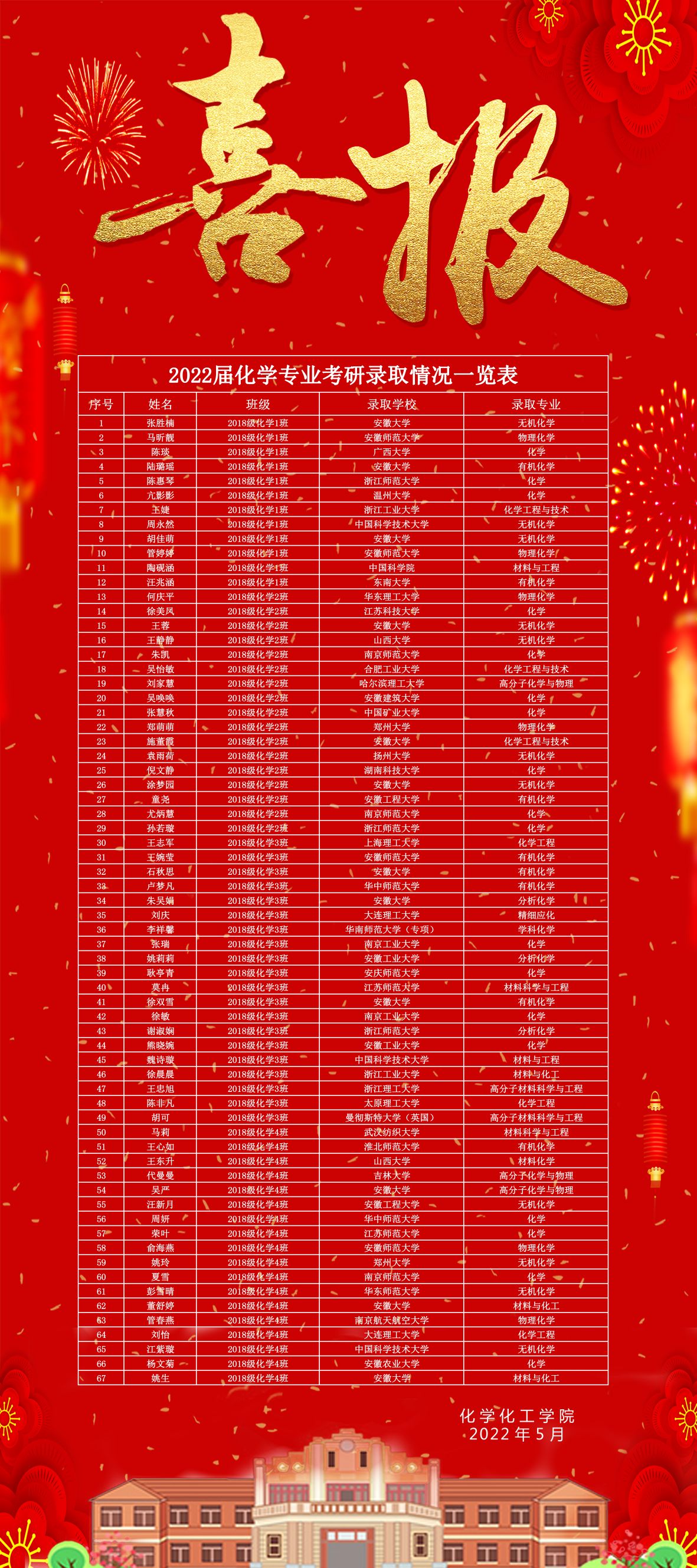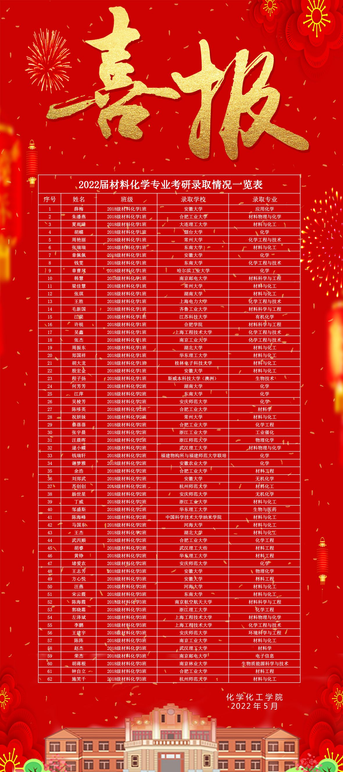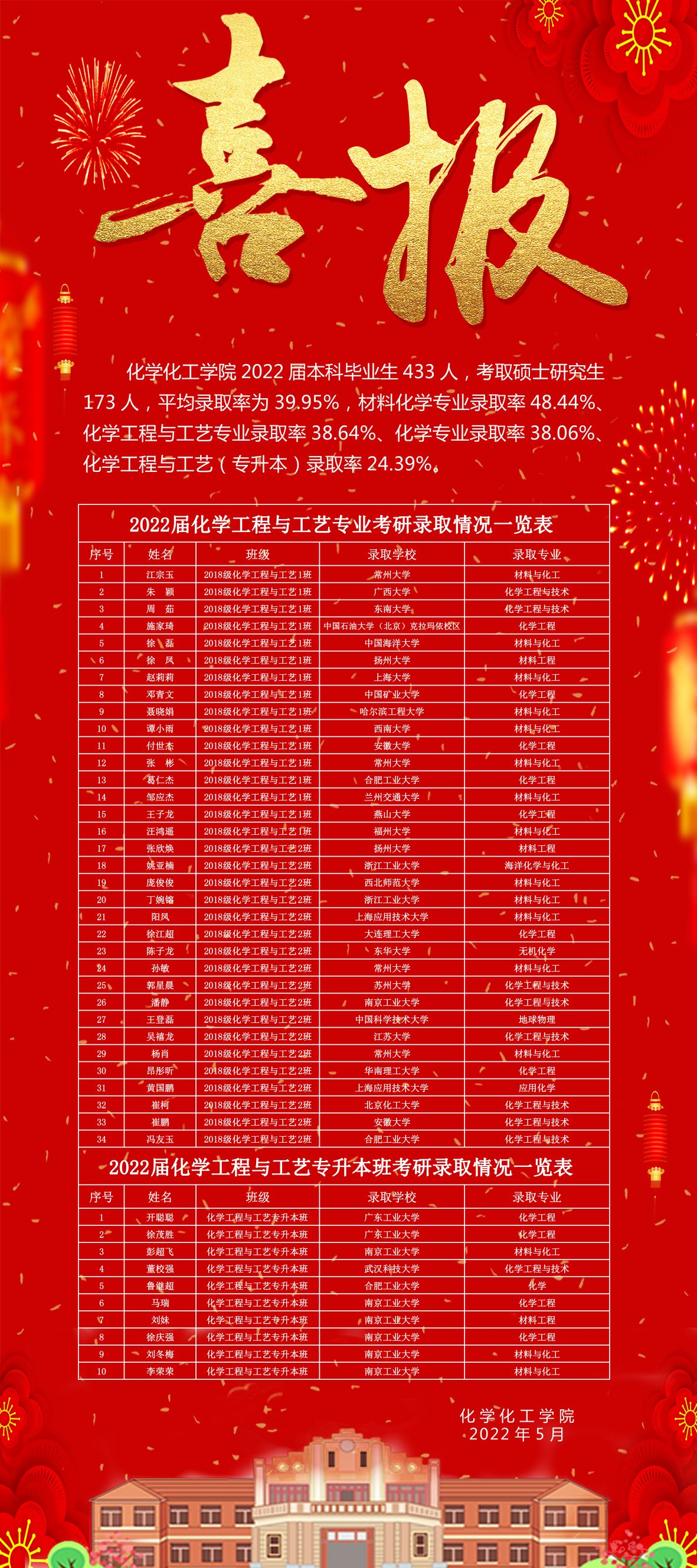 近日,化学化工学院2022届毕业生考研“再结硕果”,173名本科生考取研究生,考研录取率达到39.95%,其中材料化学专业达到48.44%。