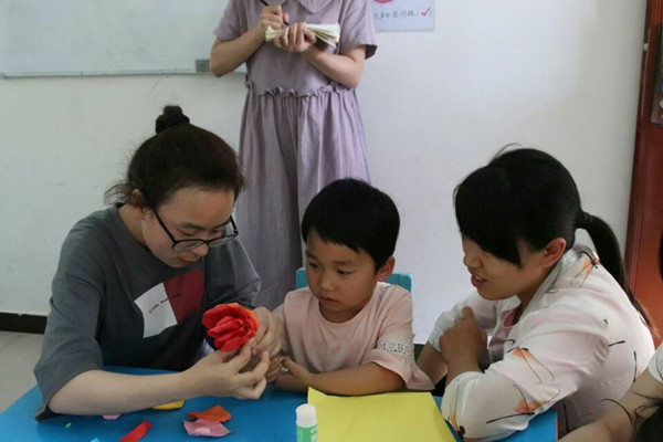 特殊教育专业2018级郭少杰先向他所带的何张辉小朋友演示了一次制作方法,再将制作步骤分解成一个个小指令,带着小朋友动手制作。每位“小老师”带着各自对接的小朋友们卷出花茎、涂上胶水、粘上花瓣。“他们的动手能力很强。”每位小朋友都跟着老师们亲手制作出玫瑰花。