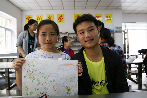 每个大学生会帮助一个到两个聋哑学生绘画,活动前在纸上相互写下自己的姓名,互相认识后,便开始协作绘画。