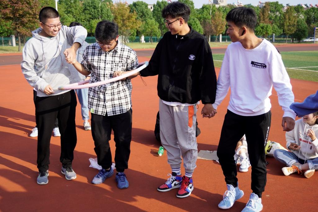 在“传呼啦圈”环节中,七人组队手牵手,小组成员逐个穿过呼啦圈实现传递,最后一位传递者需要将呼啦圈转三圈。由于身高较高,新闻传播学类专业2021级(5)班的张翔宇在传递呼啦圈时被卡住。“我平时不经常接触呼啦圈,在传递的过程中耽误了一些时间。”他表示,虽然没有赢得游戏,但他加深了与同学们之间的了解。