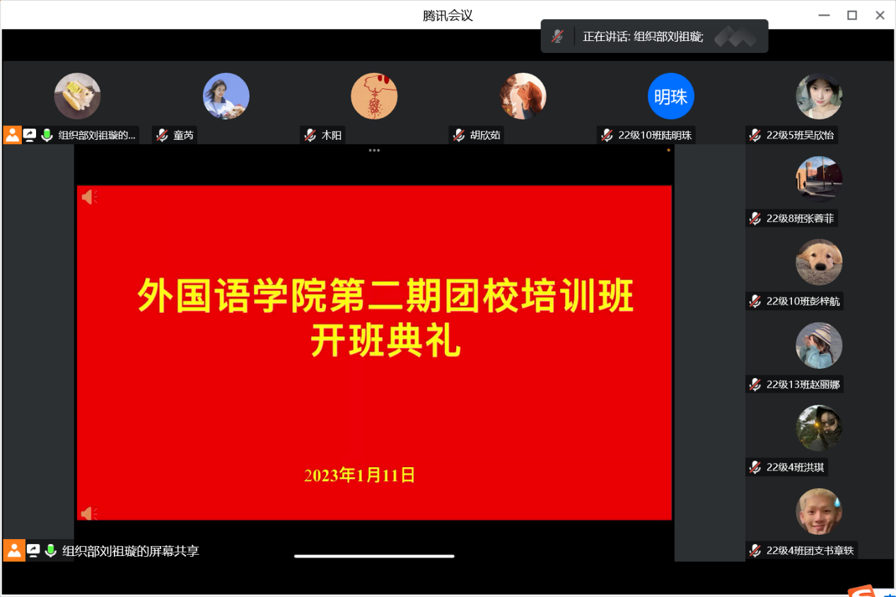1月11日,外国语学院第二期团校培训班开班典礼于线上举行,学院团委负责人、本期入团积极分子及2022级新生团支书近50人参会。