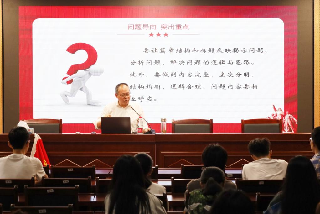 “老师,我们平时写作怎么才能抓住侧重点?”“老师,论文写作中怎样才能使研究的问题更有针对性?”……讲座结束后,学生们踊跃提问,崔汪卫逐一解答。他强调多看多写多揣摩,才能慢慢培养起对重点的敏感性,同时论文要明确研究问题,坚持内容为主题服务。
