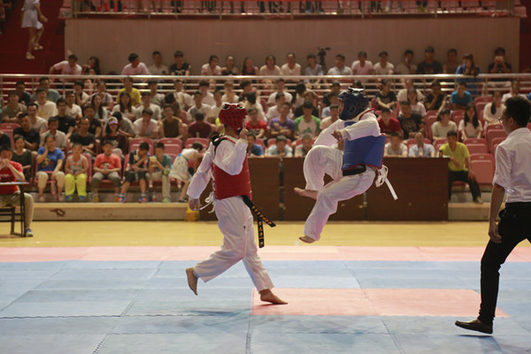 晚上6点40分,一场由2013级跆拳道班带来的开场节目便抓住了现场观众的心。身穿白衣腰系黑带的他们,现场带来了横踢、腾空三连踢破板等。更是有四人卧地,一人跳过他们腾空侧踢破板,引得现场观众倒吸一口气。开场表演后,第一类轻重量级比赛正式开始。由红方黄志平对战蓝方刘俊。一上场,两人都没有贸然进攻。突然,蓝方前后换腿,紧接着双腿连踢率先攻击,红方迅速反应后退躲过攻击,顺势侧踢蓝方腰部护具成功得分。红方乘胜追击,转身、出脚、踢头,动作连贯一气呵成,最终红方黄志平赢得了轻重量级比赛。“他们俩一个踢一个防,看得我心惊胆战!”来自2014级体育学院体教的王桂新说。